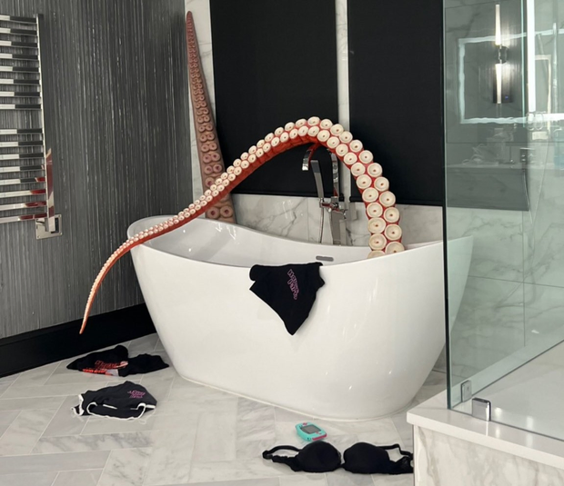 We also wanted to share a picture from Liz Katz’s social media. Showing off her monday mood, it displays a bathtub equipped with giant tentacles. And, wait, what’s that on the ground beside it? Is that the House Party logo?